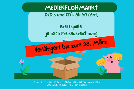 Medienflohmarkt "Im Höfle" Wir setzen noch einen drauf. Der Flohmarkt geht nun bis zum 28. März. CD's und DVD's gibt es bereits ab 50 cent. Brettspiele je nach Preisauszeichnung.