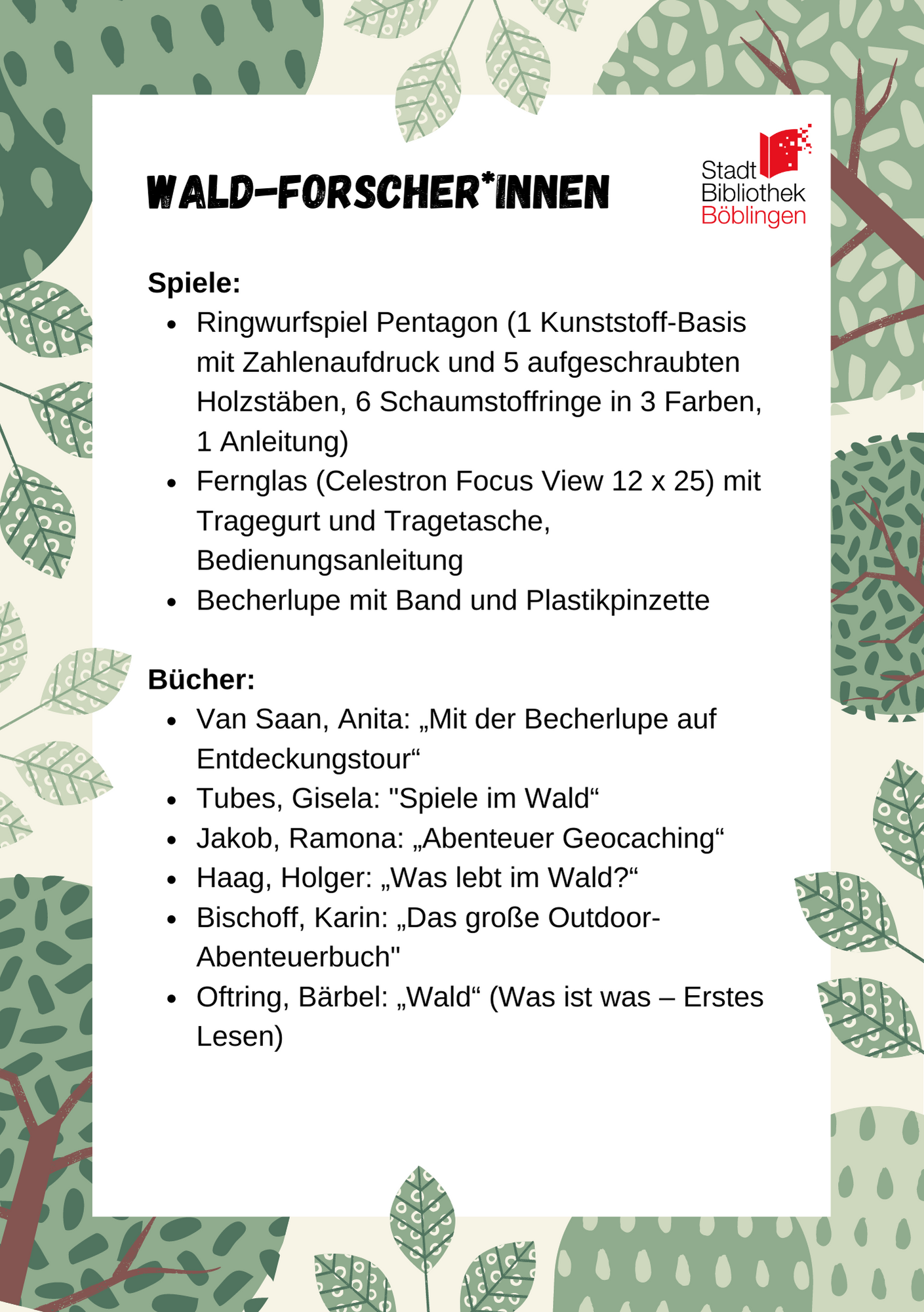 Den Wald entdecken, im Garten spielen oder Abkühlung durch Wasserspaß? Die neuen Spiel- und Lesetaschen der Stadtbibliothek Böblingen bieten einen gelungenen Mix aus Spiel- und Entdeckungsmöglichkeiten sowie Kinderbüchern.